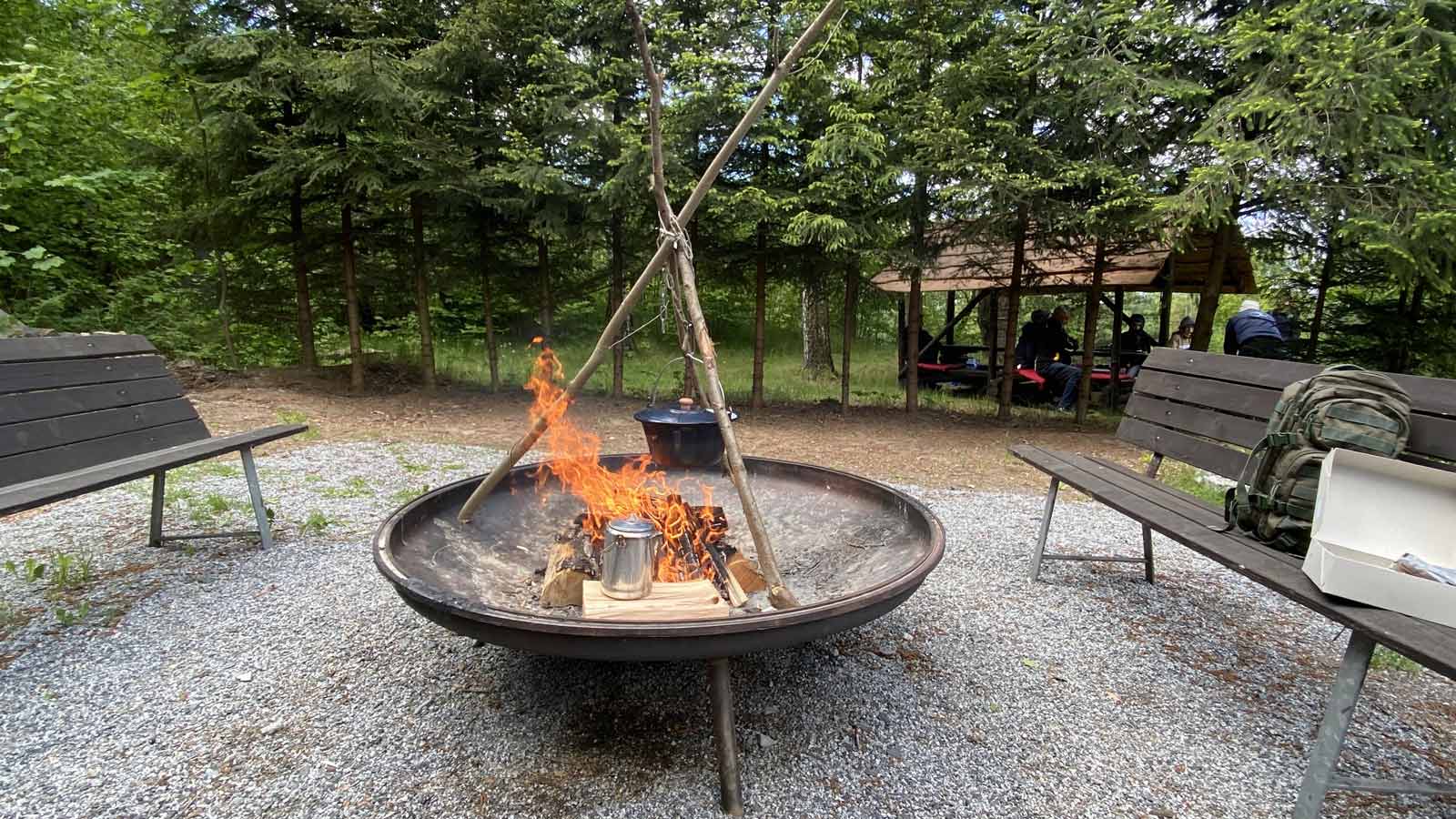 Pünktlich zum Mittag gibt es am Lagerfeuer einen kräftigen Kesselgulasch und Glühwein.
